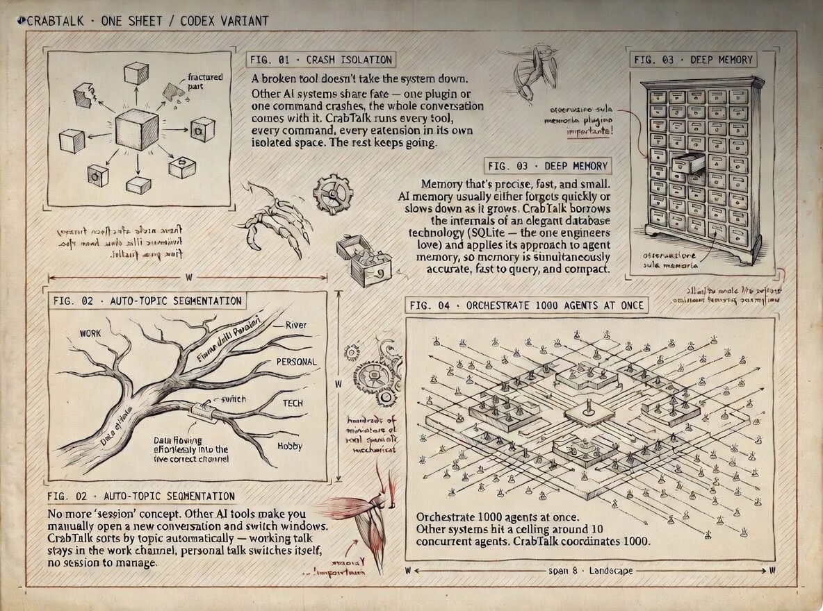 CrabTalk runs every tool, every command, every extension in its own space. One breaks; the rest keep going.